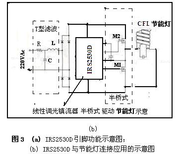 從圖3(a)可知,IRS2530D為8引腳控製IC,采用IR的專利鎮流器和高壓技術。一個高壓管腳可檢測半橋電流和電壓,以實現必要的鎮流器保護功能;DC調光輸入電壓基準與AC燈電流反饋相結合,可以實現單管腳調光;IRS2530D還具有內部非零電壓切換保護和內部振幅因數保護,防止燈泡故障損壞鎮流器。圖3(b)為IRS2530D與節能燈連接應用的示意圖。