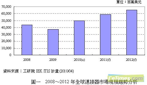 2009年下半年4C應用市場穩定複蘇,使連接器產業大體回到正常成長軌道,2010年初雖有缺工缺料、南歐主權債信因素產生少許幹擾,但並未影響整體產業穩健成長的大趨勢,除5月歐洲筆電拉貨趨緩小幅影響連接器出貨動能外,6、7月全球市況已轉趨穩定,且隨著智能型手機、LED TV、電子書、平板電腦等新興應用相繼問世,也可望帶動連接器全年產值重回金融風暴前高峰,估計2010年全球連接器市場值將達到498億美元曆史新高。