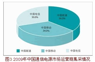 2009年中國移動、中zhong國guo聯lian通tong及ji中zhong國guo電dian信xin三san大da運yun營ying商shang都dou對dui通tong信xin電dian源yuan產chan品pin進jin行xing了le批pi量liang采cai購gou,三san家jia運yun營ying商shang采cai購gou規gui模mo相xiang差cha不bu大da,其qi中zhong中zhong國guo聯lian通tong的de集ji采cai量liang略lve高gao於yu其qi他ta兩liang家jia運yun營ying商shang,占zhan36.0%的份額。圖3是2009年中國通信電源市場運營商集采情況。