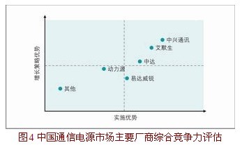 應用Frost&Sullivan公司GEM研究方法,從增長戰略及實施力兩個緯度,綜合評估中國通信電源市場主要供應商,如圖4所示。