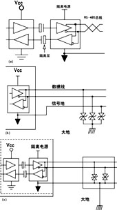 實際應用中可以將二者結合起來靈活運用(圖5c)。隔離接口對大幅度瞬態幹擾進行隔離,而旁路元件保護隔離接口不被過高的瞬態電壓擊穿。