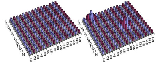 圖4為AD7142 CDC和MAX IIZ CPLD相結合後的2D電容測量結果,顯示了16條走線,即,對x軸進行了16次劃分。左側是基線電容測量,而右側是兩個手指觸摸傳感器後的結果。圖中藍色和紅色采樣行表示哪一SRC走線被激活。