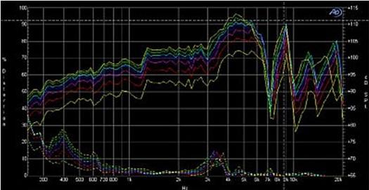 圖1:揚聲器+音箱頻率響應以及信號電平失真。