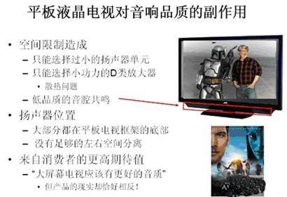 他指出要設計好的電視音響則需要有好的揚聲器單元、大的電視機空間(便於散熱)、更好的揚聲器空間分離(實現雙聲道立體聲效果)、對低頻補償,但是看看現在平板電視,基本是否定了這些要素:例如LCD-TV在采用LED背光後變的更薄、很多液晶電視的音箱放置於電視底端造成空間分離不明顯、由於電視變薄散熱問題加劇廠商把音頻輸出功率降低,所有這一切造成了了一個後果:電視機屏幕越大聽覺體驗越差!