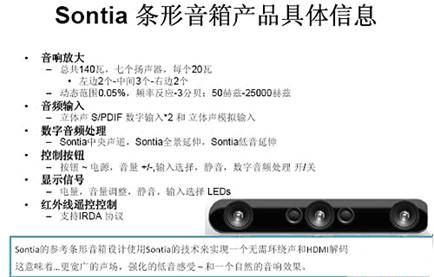 Sontia的業務模型比較有特點,也采用授權模式,主要模式是Sontia授權其3-聲道條形音箱參考設計,Sontia為OEM提供了一個可以直接生產的完整套裝,或者采用預付版權費以及與銷售量有關的版權費模式,Sontia未來的產品走向將向高端條形音箱參考設計、便攜式多媒體播放器的底座(iPod)以及Sontia的數字音頻處理技術直接嵌入到電視裏中的軟件解決方案發展。