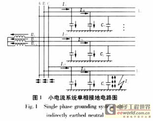 對於一個中性點絕緣係統,發生單相接地故障時的等值電路如圖1所示,由於配電網線路中各相對地的泄漏電導比線路對地電容的導納小得多,所以分析時忽略了泄漏電導,並認為三相對地電容相等。