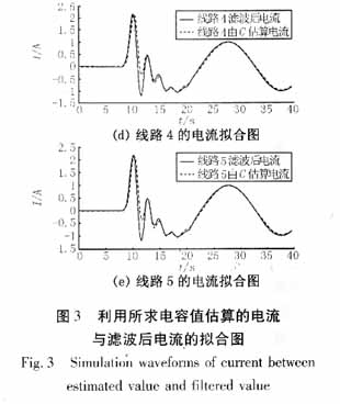 對上述方法用Matlab編程,對仿真數據進行分析,求解係統對地電容值。考慮到噪聲汙染以及各種隨機幹擾的存在,先對故障數據進行數字濾波,將17次以上的諧波去除後再對仿真或實測數據進行運算。本例所得由電容所計算電流與濾波後電流擬合波形如圖3所示(本文對數據濾波時采用的是巴特沃思濾波器,除去9次諧波以上的高次諧波)。
