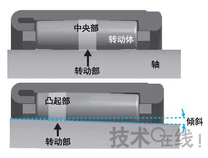 (圖2·噪聲增大的機製:軸傾斜時,滾動體的滾動部從中央部向凸起部移動。凸起部的精度比中央部低,因此產生不穩,使得噪聲增大)