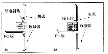 屏蔽連接器方法有,加指形簧片或墊片。連接器的搭接,是在連接器和機殼之間填滿空處。這個方法要求有一個襯墊(圖2A)。金屬襯墊較好,隻要處理合適,也就是說,隻要表麵不被汙染,隻要手不觸及或損壞襯墊以及隻要有足夠的壓力,以保持好的、低阻抗的接觸。