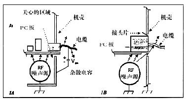 使共模電流注入到I/O區的另一機理,是附近有強的幹擾源的耦合。甚至有些“屏蔽”連接器也無用,因為幹擾源就在連接器附近,如PC機環境。如果在連接器和底板之間有一個缺口,此處所感應的RF電壓可以使EMC性能下降(圖1B)。