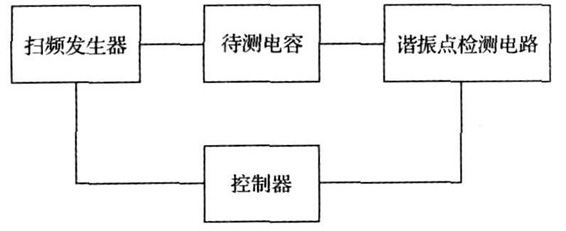 同時諧振發生時整個LC 回路表現出的阻抗為純阻性, 即感抗和容抗之和為零。利用這個原理, 使用一個掃頻信號激勵待測電容, 測量出諧振頻率, 再結合式(1) 即可測出寄生電感的大小 。根據該原理, 設計1 個掃頻發生器產生掃頻信號激勵待測電容, 然後找出諧振點, 讀出諧振頻率即可求出電容的寄生電感。其結構如圖3 所示。