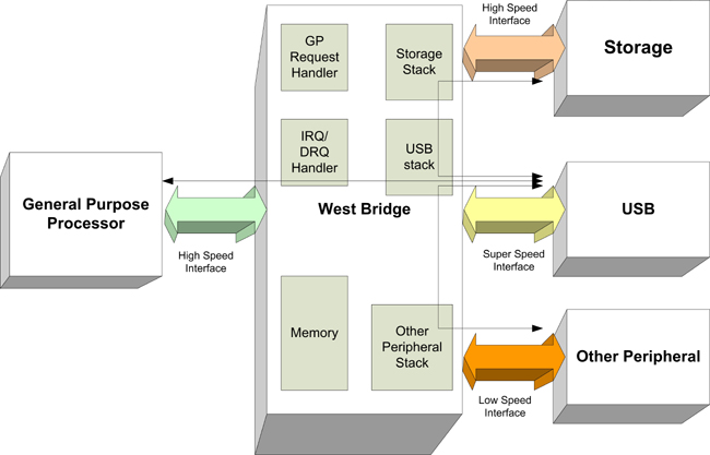 上表反映了使用特定應用的I/O處理器(如西橋)時,GP必須處理的中斷減少的數目。沒有西橋,GP要處理大量的中斷,產生‘super speed’迫使GP要很長時間保持空閑狀態(由於次要的內容切換)。相反,GP可以把這些任務釋放給西橋,保持其處理其他實時任務的效率,充分發揮 USB 3.0的潛力。西橋結構不僅可以簡化整體係統平台結構,它還可以提高整體性能並降低項目風險。