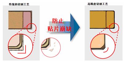 近(jin)年(nian)來(lai),智(zhi)能(neng)手(shou)機(ji)市(shi)場(chang)的(de)需(xu)求(qiu)迅(xun)猛(meng)增(zeng)長(chang),多(duo)功(gong)能(neng)化(hua)使(shi)手(shou)機(ji)產(chan)品(pin)的(de)零(ling)部(bu)件(jian)數(shu)量(liang)增(zeng)加(jia),因(yin)此(ci),可(ke)高(gao)密(mi)度(du)安(an)裝(zhuang)的(de)超(chao)小(xiao)型(xing)零(ling)部(bu)件(jian)的(de)需(xu)求(qiu)隨(sui)之(zhi)增(zeng)加(jia)。但(dan)是(shi),以(yi)現(xian)有(you)的(de)製(zhi)造(zao)技(ji)術(shu),切(qie)割(ge)工(gong)藝(yi)中(zhong)的(de)封(feng)裝(zhuang)尺(chi)寸(cun)公(gong)差(cha)較(jiao)大(da),達(da)±20μm,不僅如此,還存在貼片崩缺等各種課題,業內認為0402尺寸以下的開發是非常困難的。
