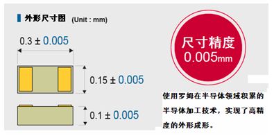 1) 采用獨創的工藝技術,實現了世界上最小的貼片尺寸:03015尺寸(0.3 mm×0.15 mm)