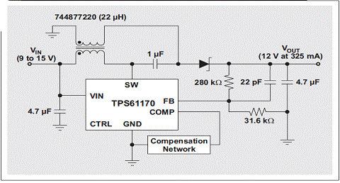 盡管DC/DC單端初級電感轉換器 (SEPIC) 拓撲不是什麼新東西,但的確直到最近它才開始流行起來,然而,對於能夠對高低輸入電壓之間的輸出電壓(例如:12V未校準插牆式電源)進行調節的轉換器需求一直都存在。雖然我們可以將任何升壓轉換器/控製器配置為一個 SEPIC,但其在最近才得到普遍的使用。兩個因素促進了 SEPIC 的人氣大增:(1) IC 製造廠商已經開始製造更多具有電流模式控製功能的升壓控製器,旨在簡化補償;(2) 電感製造廠商已經開始製造許多可以最小化轉換器總 PCB 體積的單封裝耦合電感。改用耦合電感以後,許多具有兩個單獨電感應用的電源體積可以縮減三分之一。圖 1 顯示了使用 TI TPS61170 和 Wuerth 744877220 的一個 SEPIC。