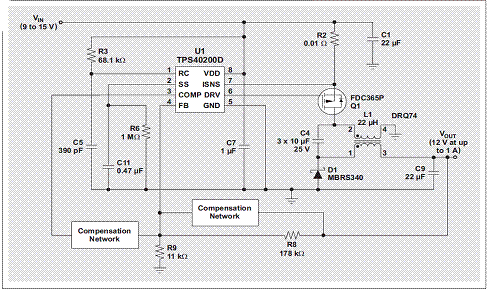 圖 2 使用 TI TPS40200 和 Coiltronics DRQ74 的 ZETA 轉換器