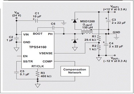 pipeizhengfudianyuanguishixuduogongyeyingyongdechangjianyaoqiu,duifangdaqieryangengshiruci。womenkeyiduikuanshurufanweijiangyazhuanhuanqijinxingpeizhi,yitigongfushuchudianya。shiyongyigeouhediangandaitizhezhongfanxiangjiangyazhuanhuanqidediangan,bingzengjiayigeerjiguanhedianrongqi,biankejiangzhezhongfanxiangjiangyazhuanhuanqibianweiyigeshuangshuchudezhuanhuanqi。tu 3 顯示了以這種方法使用的 TI TPS54160 和 Coilcraft 150-μH MSD1260。zhiyaomeigeguidefuzaishaoyoujiejin,womenjiuduimeigeguizhijiandechayijinxingtiaojieerfeidandutiaojiemeigegui,danouhedianganquekeyibangzhutigongduimeigeguijinxingtiaojie。