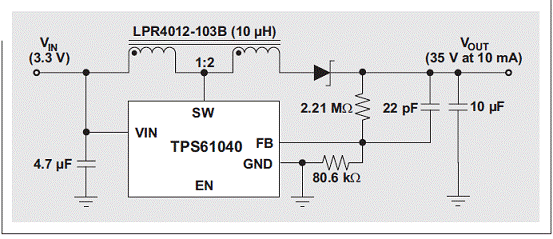 集成 FET 的 DC/DC 轉換器的輸出電壓受限於轉換器的開關電流額定值。將一個 1:1 以上匝比的耦合電感連接至轉換器的開關 (SW) 引腳,可以擴展所有升壓轉換器的有效輸出電壓範圍。例如,圖 4 顯示了 30-V 絕對最大電流額定值的 TI TPS61040 升壓轉換器,其作用是提供 35V 或更高的電壓,同時還顯示了一個 1:2 耦合電感 Coilcraft LPR4012-103B。耦合電感結構多繞組端與二極管串聯時,單繞線電感——以及由此產生的轉換器開關 FET—電壓隻有輸出電壓的三分之一,即負輸入電壓。