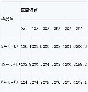 將表1所測試的電感插入恒磁片後,再加工成成品電感,取三個成品作測試樣品,測試其直流特性如表2所示(測試儀表為HP4284A,測試頻率為1kHz):