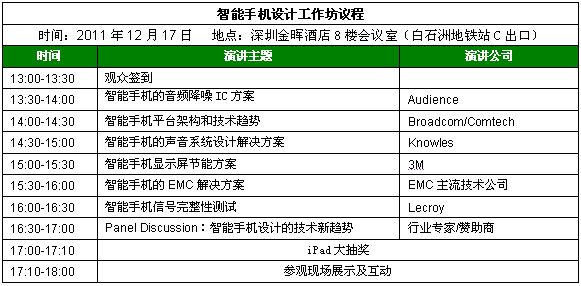 - 智能手機設計工作坊將於2011年12月17日下午在深圳金暉酒店召開