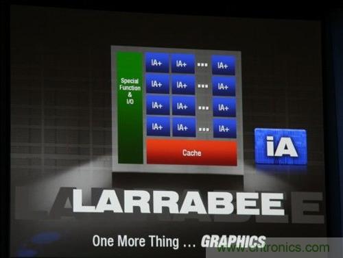 在2007年的IDF上,Intel正式揭開獨立顯卡——代號“Larrabee”的神秘麵紗,Larrabee隸屬於其萬億次運算項目(Tera-scale),也將是Intel的第一款實用級萬億次運算處理器,其處理能力“大大超過”一萬億次浮點每秒;根據Intel首席架構師EdDavis的演示文稿,Larrabee基於可編程架構,主要麵向高端通用目的計算平台,至少有16個核心,主頻1.7-2.5GHz,功耗則在150W以上,支持JPEG紋理、物理加速、反鋸齒、增強AI、光線追蹤等特性。