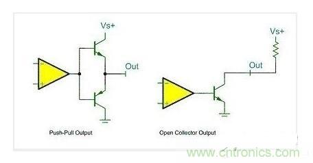 關於推挽輸出和開漏輸出,最後用一幅最簡單的圖形來概括:該圖中左邊的便是推挽輸出模式,其中比較器輸出高電平時下麵的PNP三極管截止,而上麵NPN三極管導通,輸出電平VS+;當比較器輸出低電平時則恰恰相反,PNP三極管導通,輸出和地相連,為低電平。右邊的則可以理解為開漏輸出形式,需要接上拉。