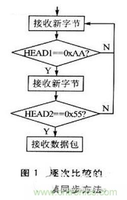此種方法代碼量小,編程簡單,一般用於在主程序中以非中斷方式接收串口數據、實時性很差、shujuzhenjiaoduandechanghe。danshi,zaichuankousuduguokuaiqiebaotouzijieshubijiaoduodeqingkuangxia,chuankoushixiantongbuhuafeideshijianhenchanghuohennanshixiantongbu。liru,chuankoujieshoudaoxulieOx0O OxAA0xAA 0x55…,當遇到第一個“0xAA”時,該方法認為第1個字節正確開始比較第2個同步頭。第2個字節仍是“0xAA”而不是“0x55”,所以必須等待新的字節重新開始比較第1個同步頭。而緊隨其後的是“0x55”,因而,此時包頭的第1個字節也沒有同步上。事實上,“0x00 OxAA”是幹擾字節,“0xAA 0x55”才是通信協議中的同步頭。