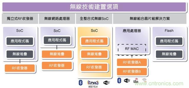 · 全整合式無線SoC:這是一種單芯片的單一建置方案,適用於特定的無線技術,尤其是用於物聯網應用的低功耗藍牙技術。鏈路層和PHY整合於SoC中,以執行所有的軟件堆棧和應用程序代碼。