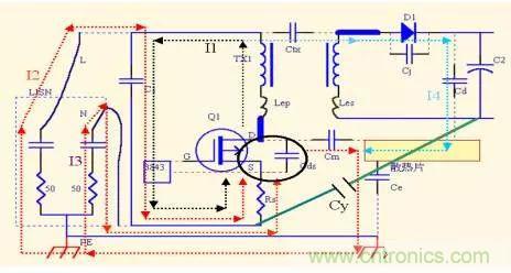 它的作用是雙重的,一是為Mosfet動作產生且串到變壓器副邊的noise 電流(如I4),提供一個低阻抗的回路,減小到地的電流。二是為二次側Diode產生的且串到變壓器原邊的noise 電流提供低阻抗回路,從而減小流過LISN的電流。