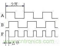 從表1可知,如果輸入端A和B分別送入占空比為50%的信號波形, 則當兩者存在相位差Dθ時,輸出端F的波形的占空比與Δθ有關,見圖3。將F輸出波形通過積分器平滑,則積分器輸出波形的平均值,它同樣與Δθ有關,這樣,我們就可以利用異或門來進行相位到電壓的轉換,構成相位檢出電路。於是經積分器積分後的平均值(直流分量)為:U = Vdd * Δ θ/π (1)