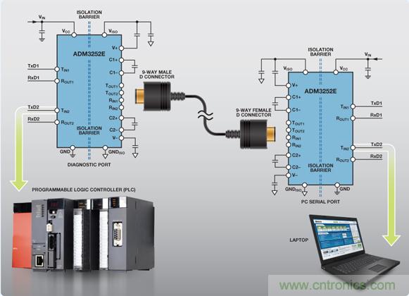 要在惡劣的工業環境下實現魯棒的數據通信鏈路,RS-232 診斷端口必須在 RS-232 電纜網絡與相連係統之間提供一個隔離接口,以預防高噪聲環境中的電壓尖峰和接地環路並提高係統穩定性(圖 1).RS-232 通信鏈路的電源隔離利用隔離式 DC/DC電源或 ADI 公司的 isoPower®集成式 DC/DC 轉換器技術實現。