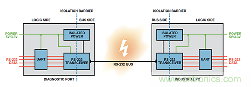 要提供隔離式 RS-232 通信接口,兩端的器件必須與所連的RS-232 電纜相互隔離。要隔離數據鏈路,則必須對數據信號線路和用於驅動該電纜的電源進行隔離。來自診斷端口上UART 的數據需要跨越隔離柵並傳輸至隔離總線側上的RS-232 收發器。本地 5 V/3.3 V 電源也需要跨越隔離柵來為隔離總線側上的 RS-232 收發器供電。工業 PC 端也同樣需要如此:數據和電源均需要跨越隔離柵(圖 3).通過將器件與 RS-232 電纜網絡隔離開來,診斷端口和工業 PC電路均受到保護,不受惡劣環境下可能耦合到 RS-232 電纜上的瞬變影響。隔離還可以中斷因診斷端口和工業 PC 端存在不同接地電位而可能出現的接地環路。RS-232 總線上可能出現的高共模電壓不能跨越隔離柵,從而保護隔離數據的用戶。