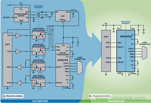 ADM3252E即是這樣的一個例子,它是一個緊湊器件中的隔離式雙通道RS-232 收發器。iCoupler隔離技術至少在以下五個方麵克服了舊式光耦合器解決方案所造成的限製:集成(由於iCoupler支持雙向操作,因此可縮小總體尺寸並降低係統成本)、性能更高、功耗更低、易於使用且可靠性更高。