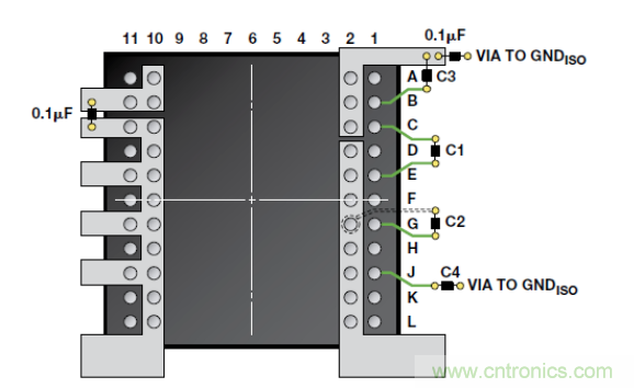 隔離收發器的PCB布局對於確保在實際設計中實現2.5 kV的額定隔離性能至關重要。主要考慮因素是邏輯端GND和總線端GND之間的爬電距離(沿殼體最短距離)和電氣間隙(最短空氣距離)。ADM3252E的邏輯接口不需要外部電路。輸入和輸出供電引腳需要電源旁路(圖 7)。欲了解有關PCB布局指南和輻射(EMI)控製結構的更多信息,請參考AN-0971 應用筆記“isoPower器件的輻射控製建議”。