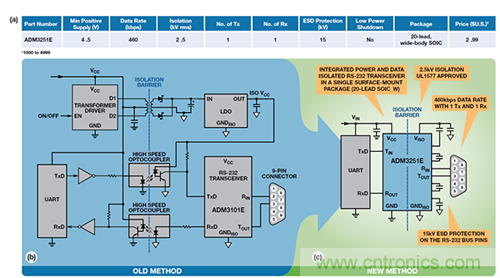 圖8. 單通道 RS232 收發器應用 (a) ADM3251E 規格(b) 傳統方法 (c) iCoupler + isoPower 方法