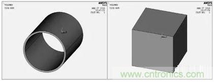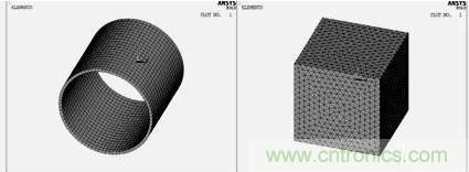 網(wang)格(ge)劃(hua)分(fen)對(dui)有(you)限(xian)元(yuan)的(de)求(qiu)解(jie)及(ji)其(qi)重(zhong)要(yao),單(dan)元(yuan)越(yue)小(xiao),網(wang)格(ge)越(yue)細(xi),則(ze)離(li)散(san)域(yu)的(de)近(jin)似(si)度(du)越(yue)好(hao),計(ji)算(suan)結(jie)果(guo)也(ye)越(yue)精(jing)確(que),但(dan)計(ji)算(suan)量(liang)及(ji)誤(wu)差(cha)都(dou)將(jiang)增(zeng)大(da)。本(ben)文(wen)建(jian)立(li)的(de)線(xian)圈(quan)模(mo)型(xing)是(shi)一(yi)個(ge)規(gui)則(ze)的(de)柱(zhu)體(ti),采(cai)用(yong)體(ti)掃(sao)掠(lve)方(fang)式(shi)劃(hua)分(fen)網(wang)格(ge)。空(kong)氣(qi)模(mo)型(xing)經(jing)過(guo)澆(jiao)築(zhu)之(zhi)後(hou)形(xing)狀(zhuang)變(bian)得(de)複(fu)雜(za),采(cai)用(yong)自(zi)由(you)方(fang)式(shi)劃(hua)分(fen)網(wang)格(ge)。圖(tu)2為線圈和空氣的有限元模型,最後通過numcmp命令將其澆築在一起。