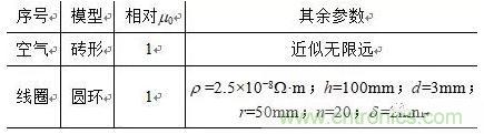 以XOY平麵為圓平麵,Z軸為高度建立線圈圓環模型,空氣模型為磚形,如圖1所示。通過布爾操作中的over運算將空氣介質與線圈澆築在一起。材料屬性和模型參數設置見表1。