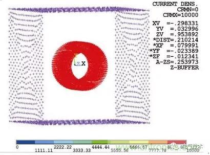 線xian圈quan作zuo為wei載zai流liu塊kuai導dao體ti,模mo型xing是shi柱zhu形xing,所suo以yi加jia載zai電dian流liu時shi需xu加jia載zai環huan形xing電dian流liu。切qie換huan當dang前qian坐zuo標biao係xi為wei柱zhu坐zuo標biao係xi,將jiang環huan形xing電dian流liu加jia載zai在zai有you限xian元yuan單dan元yuan上shang,電dian流liu方fang向xiang水shui平ping向xiang右you。線xian圈quan單dan元yuan采cai用yong電dian磁ci場chang分fen析xi操cao作zuo選xuan項xiang,源yuan電dian流liu密mi度du可ke以yi直zhi接jie加jia在zai有you限xian元yuan單dan元yuan上shang,如ru圖tu3所示。