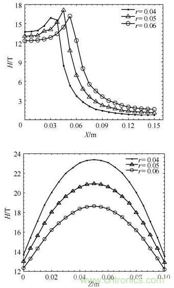 當r一定時,徑向方向的磁場強度在半徑範圍外隨著徑向距離的增大顯著減少;縱向方向的磁場強度隨著縱向距離的增大先增大後減小。磁場強度在d=r處有最大值。同時,隨著線圈半徑的增大,磁場的覆蓋範圍也增大。