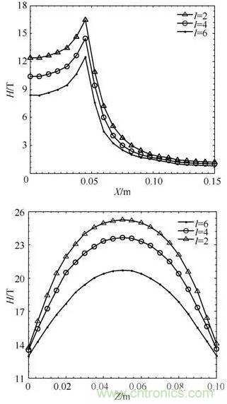當l一定時,徑向距離上的磁場強度在半徑範圍外隨著距離增大顯著減小。縱向距離的磁場強度隨著距離增大先增大後減小。在l=Rm處,磁場強度均有最大值,同時,匝間距的增大使得線圈的總高度增加,磁場覆蓋範圍增加。
