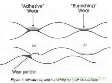 在(b)處較弱的界麵可能在原始界麵處或附近斷裂,很少發生磨損。(a)處的磨損過程通常稱為粘著磨損,(b)處的磨損過程稱為拋光磨損。如果在放大鏡下觀察連接器咬合過程中產生的磨損軌跡,在30~50倍放大時,粘著磨損軌跡將顯示出磨損顆粒的跡象,並顯得有些粗糙,而拋光磨損軌跡將顯得光滑和光亮。