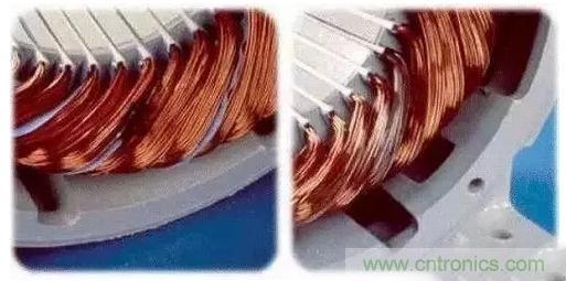 上圖為4極電機缺相燒壞圖片,電機線圈對稱燒壞就是缺相燒壞,星形接法缺相燒的話,2極電機隻有2組線圈是好的,4極電機對稱燒隻有4組線圈是好;三角形連接缺相燒的話,2極電機對稱燒2組線圈,4極電機對稱燒4組線圈。