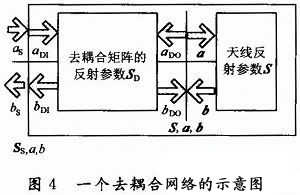為了使正交模式的輻射效率最大,文獻和文獻詳細論述了等效耦合參數的方法。對於一個雙天線係統,等效去耦合網絡如圖4所示,其中S是天線的反射參數,SD是去耦合網絡的反射參數,文獻指出加入了去耦合係統的S參數可以表示為: