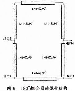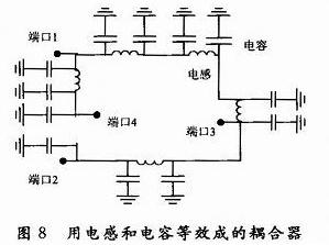 由於第二部分設計的天線傳輸線阻抗是50 Ω,所以1/4傳輸線的阻抗是70.7 Ω,將710 MHz代入,則可以求得L=15.8 nH,C=3.17 pF。這樣,就可以設計出180°的混合耦合器如圖8所示。將耦合器的3,4端口通過通孔連接天線,1,2端口接饋電網絡,就可構成一個雙天線的去耦合係統。