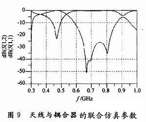為了降低多個天線之間的耦合,人們想出了各種辦法。其中一種有效的方法就是使用DMN(Decoupling and Matehing Networks)技術。具體的設計方法與實例文獻均有論述,但是文中並沒有給出具體的理論說明。文獻提出了一種采用正交模式分析的方法,通過S參數分析,從理論上給出了一種合理的去耦合方法。本文采用文獻給出的S參數分析方法,對文獻提出的710 MHz天線之間的耦合進行研究,並通過計算設計出一種采用集總參數元件構成的耦合器與匹配網絡去掉兩個天線之間的耦合。通過HFSS和ADS聯合仿真可以看出,S12與S21參數得到了明顯改善。