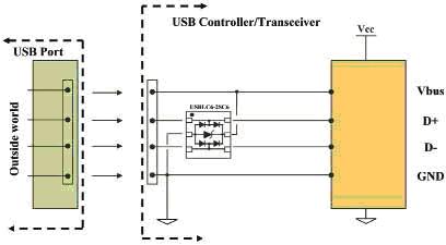 這個辦法的實質是在USB接口附近連接一個保護元器件。它由幾支采用軌對軌結構的二極管組成,本身具有低電容的特性。內部鉗位器件為兩條數據線提供±25kVESD(ISO10605)保護功能,以及為Vbus電源線提供保護功能。