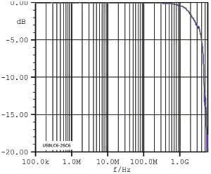 圖3中截止頻率大約為5GHz,遠離USB480Mb/s收發器的正常工作頻率,因此,USB收發器可以安全工作。
