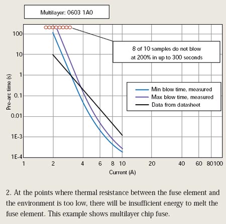 若熔斷元件和環境間的熱阻抗過低,將沒有足夠能量融化熔斷元件。這將使保險絲不能在120秒內切斷相當於額定電流兩倍的過載電流。圖2和圖3說明了多層片式保險絲以及激光調割厚膜芯片保險絲的這種情況。