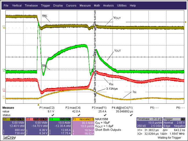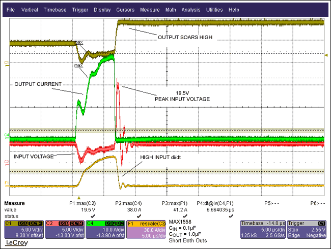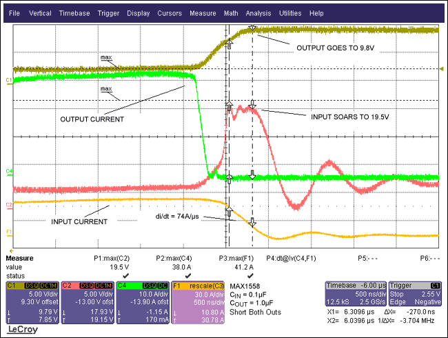 圖2.波形顯示了具有10µFCBYPASS情況下的短路響應,從VIN波形可以看出:由於電流變化使得輸入電壓上衝到了8.6V。
