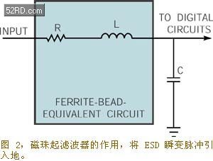 一種可在電路輸入級使用的簡單的ESD瞬變抑製技術,就是將一個磁珠串在輸入引線上,並在輸入引線和地之間接一隻容量很小的電容器。圖2示出了磁珠的等效電路。輸入端的LC電路起濾波器的作用,將ESD瞬shun變bian的de能neng量liang分fen流liu入ru地di。當dang使shi用yong瞬shun變bian抑yi製zhi二er極ji管guan保bao護hu任ren何he輸shu入ru端duan或huo輸shu出chu端duan時shi,要yao使shi瞬shun變bian抑yi製zhi器qi盡jin量liang靠kao近jin這zhe些xie端duan子zi。很hen長chang的de導dao線xian和he電dian路lu板ban印yin製zhi線xian都dou有you寄ji生sheng電dian感gan,當dangESD瞬變脈衝進入電路時,寄生電感就會產生電壓過衝與振鈴問題。